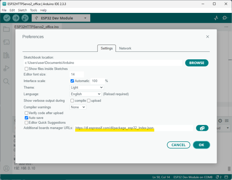 - File > Preferences에서 Additional boards manager URLs:에 아래 주소를 입력하고 OK.