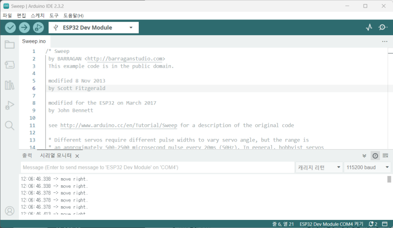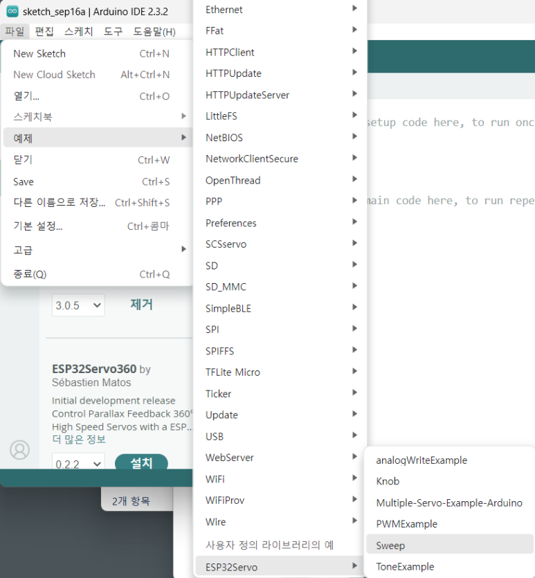 - '파일 > 예제 > ESP32Servo > Sweep' 예제를 선택한다.
