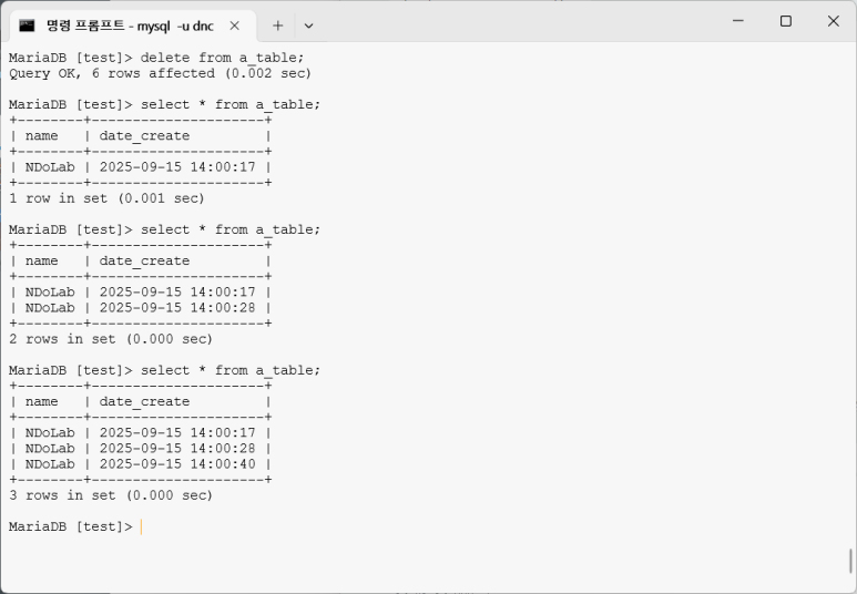 생성된 table에 데이터베이스 자료 생성 명령어를 이용하여 자료를 입력하고 확인하면 다음과 같다.