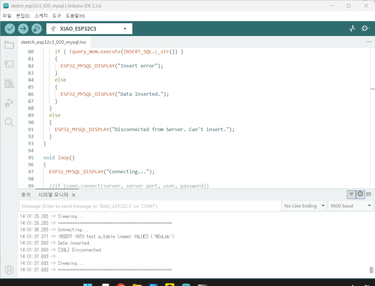 - ESP32-C3에 데이터베이스 서버에 접근하여 테이블에 레코드 입력 프로그램 업로드